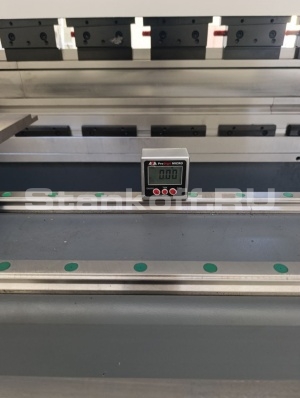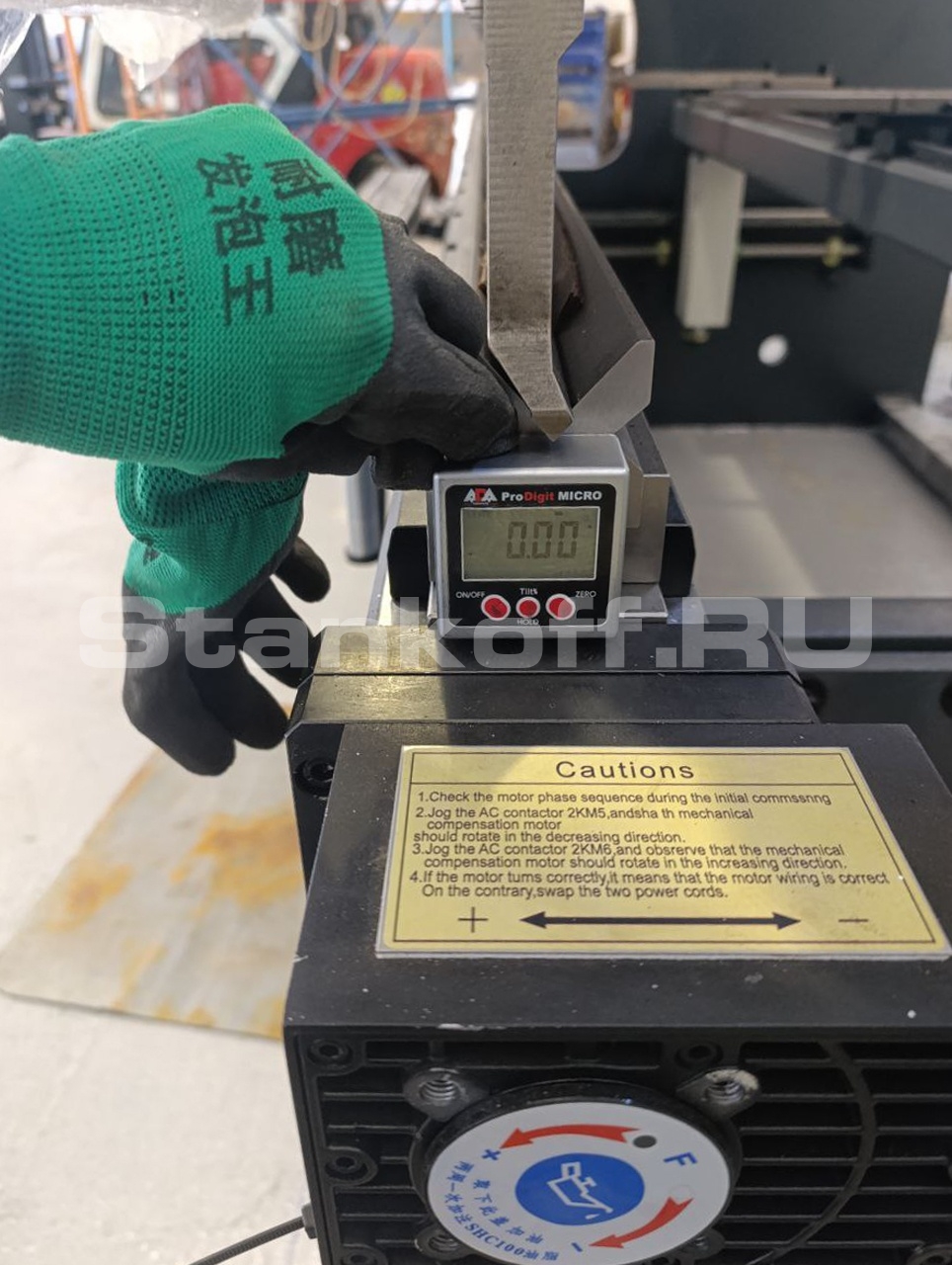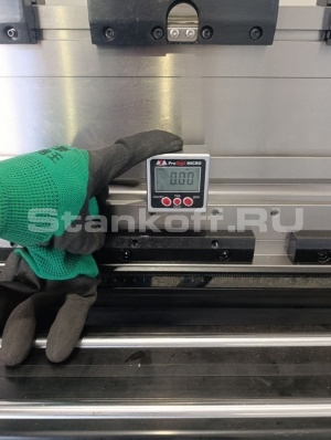 Во время пусконаладки были откалиброваны и настроены упоры листогибочного пресса, станок был подключен к электропитанию, была выполнена проверка направления главного двигателя и его кодировка, проверены установки концевых выключателей мертвой точки, проверка переключения с быстрого хода вниз на рабочий, матрица пресса была установлена в нужное положение. Произведена смазка ШВП и линейных направляющих. Были определены параметры гибки металла, с персоналом клиента был проведен инструктаж по работе со станком и его обслуживанию.