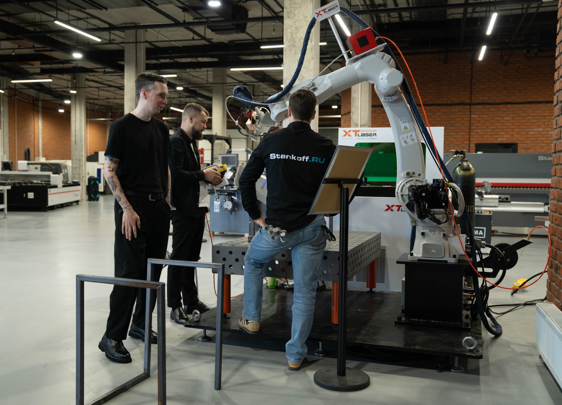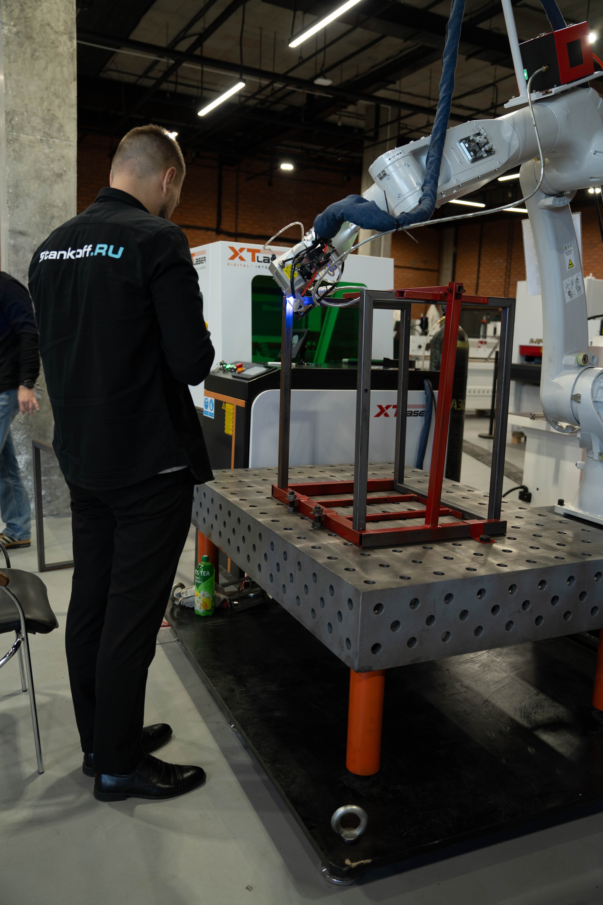 ✨ Затем перешли к роботизированному комплексу лазерной сварки XTW-3000 — наши гости увидели, как он быстро и точно сваривал металлические детали.