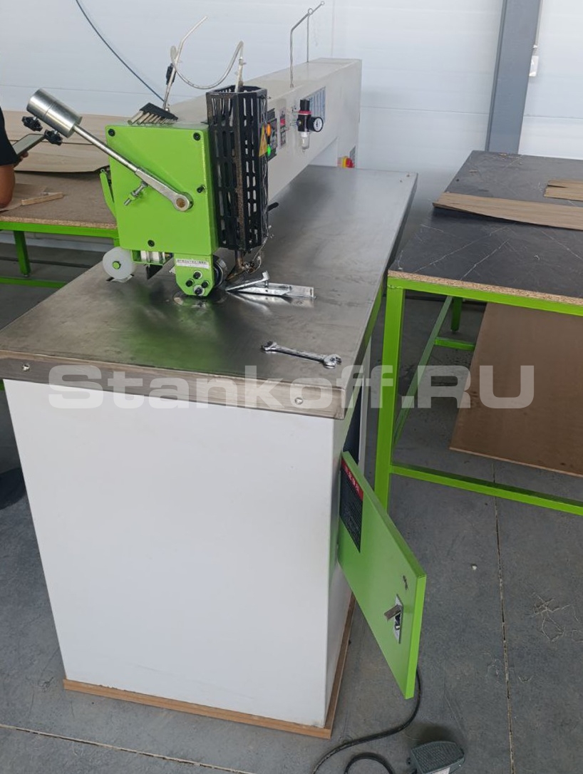 Станок сшивает шпон в рубашки прочной, химически стойкой клеевой нитью, наносимой зигзагом с подогревом. Применяется на деревообрабатывающих предприятиях при наборе облицовок дверных полотен и панелей, обеспечивая плотное стыкование и высокую прочность.