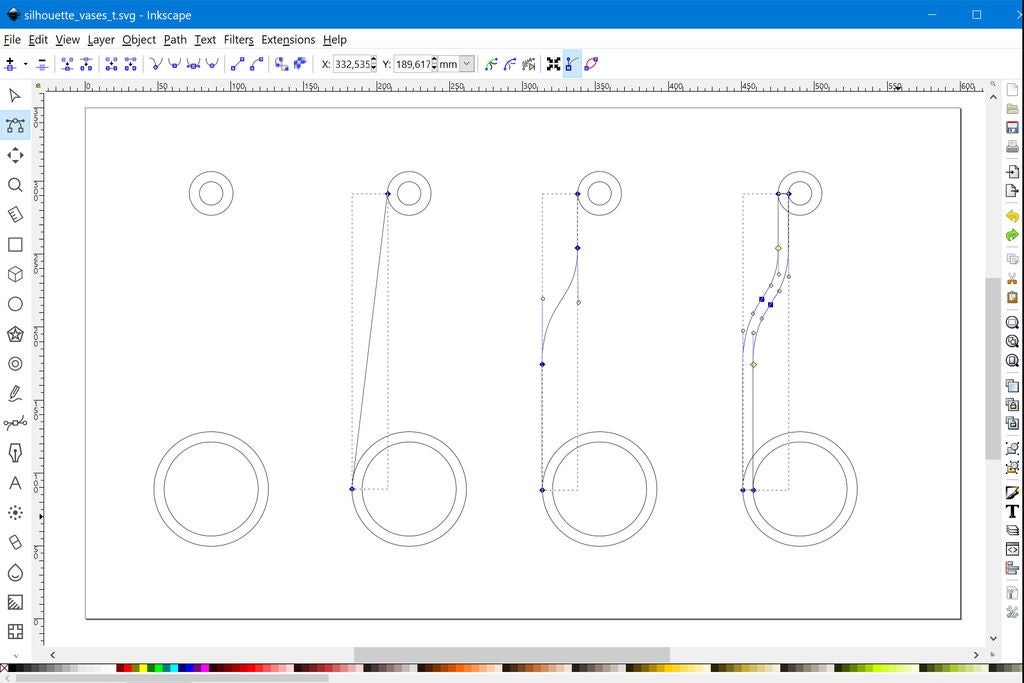 Для боковых частей мой процесс состоял в том, чтобы сначала просто нарисовать одну линию, идущую от внешнего края верхнего круга к внешнему краю нижнего круга. Затем я добавил дополнительные контуры и кривые, чтобы получить силуэт бутылки. Вы можете поиграть с различными формами здесь. Как только я был доволен формой, я установил ширину обводки на 7 мм, а затем использовал команду "Stroke to Path", чтобы превратить обводку в контур.