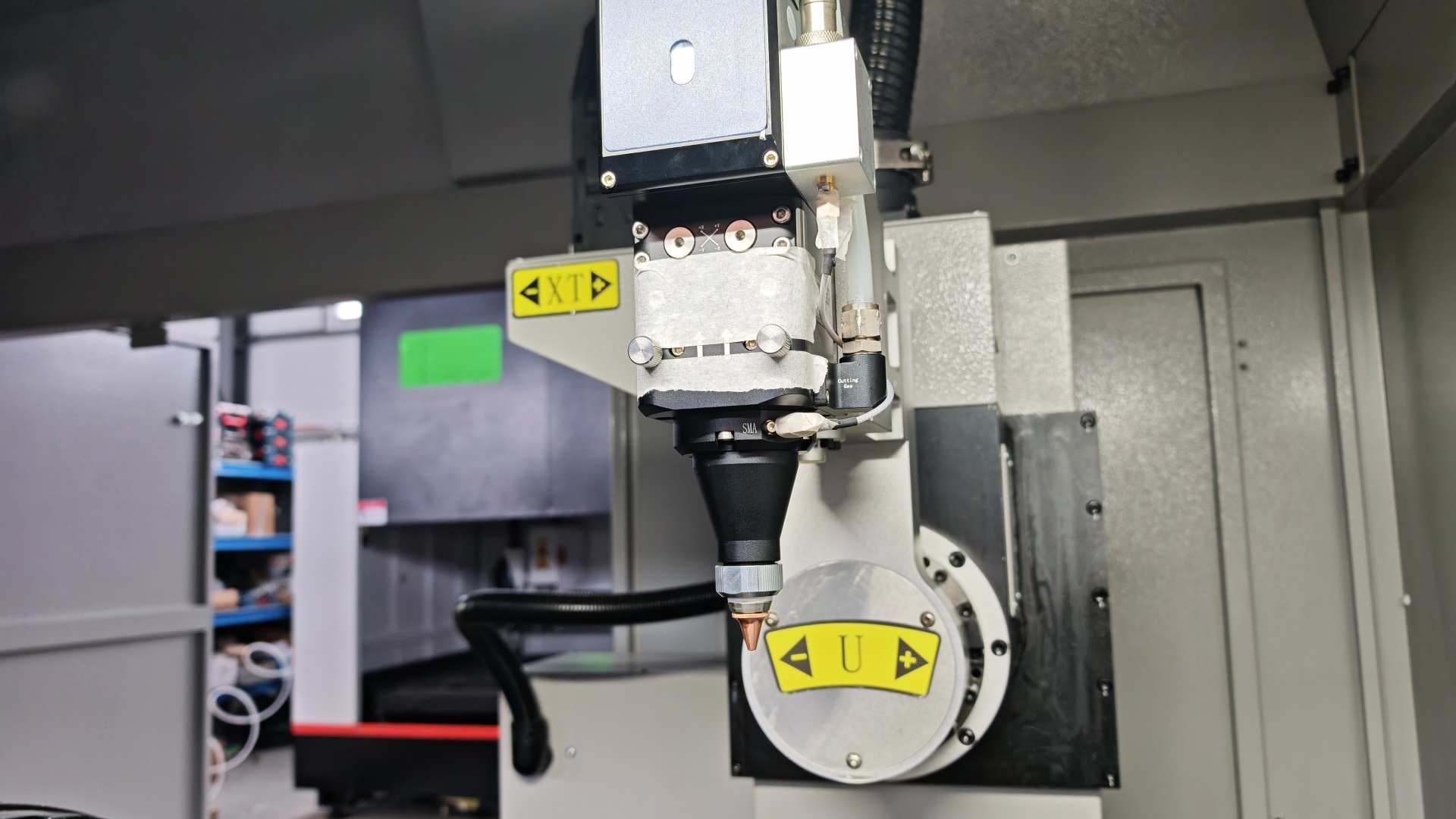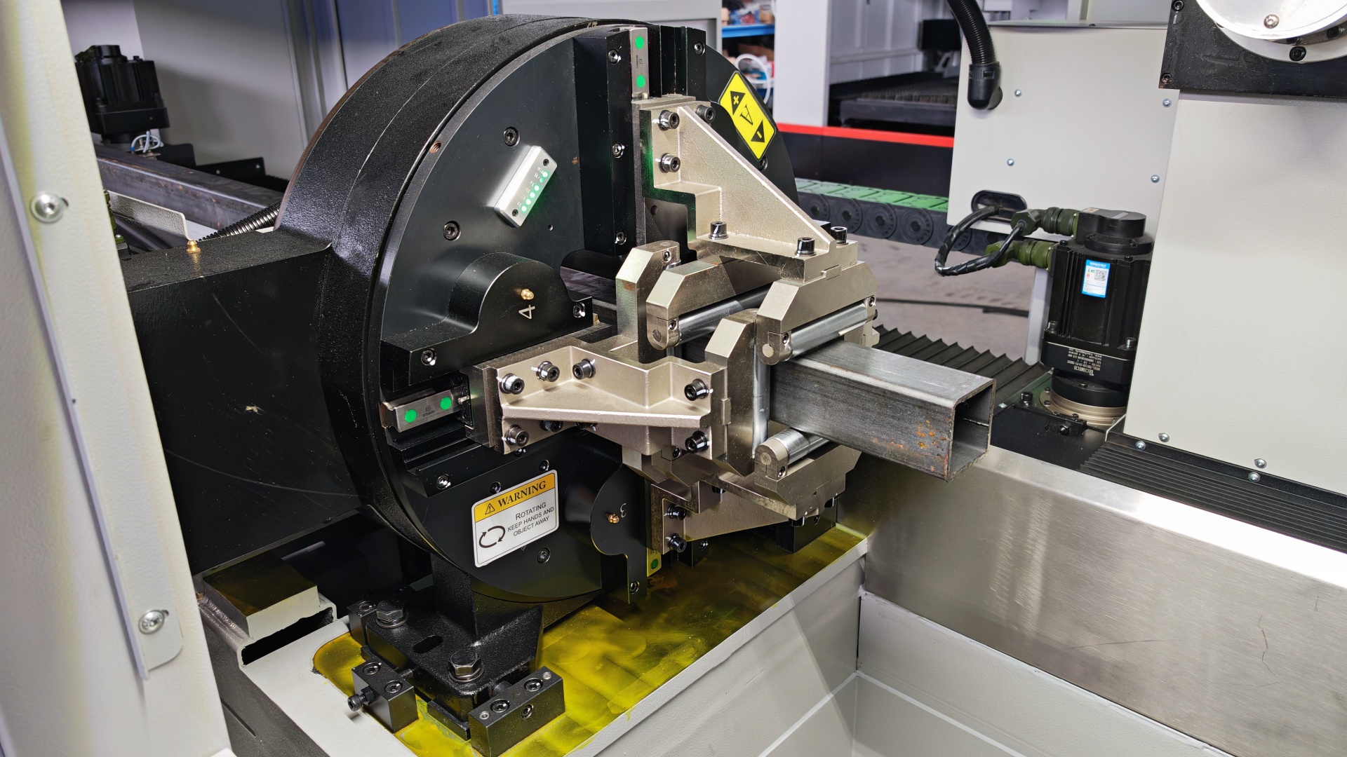 🎯 Наклонная лазерная голова Ospri с автофокусом. Угол реза ±50°. Главное преимущество — ёмкостный датчик отслеживает контур трубы в режиме реального времени, а не движется по заданным координатам, как на большинстве аналогов. Это принципиально важно при работе с изогнутыми, нестандартными или геометрически нестабильными трубами: станок постоянно адаптируется к фактической поверхности, сохраняя качество реза;