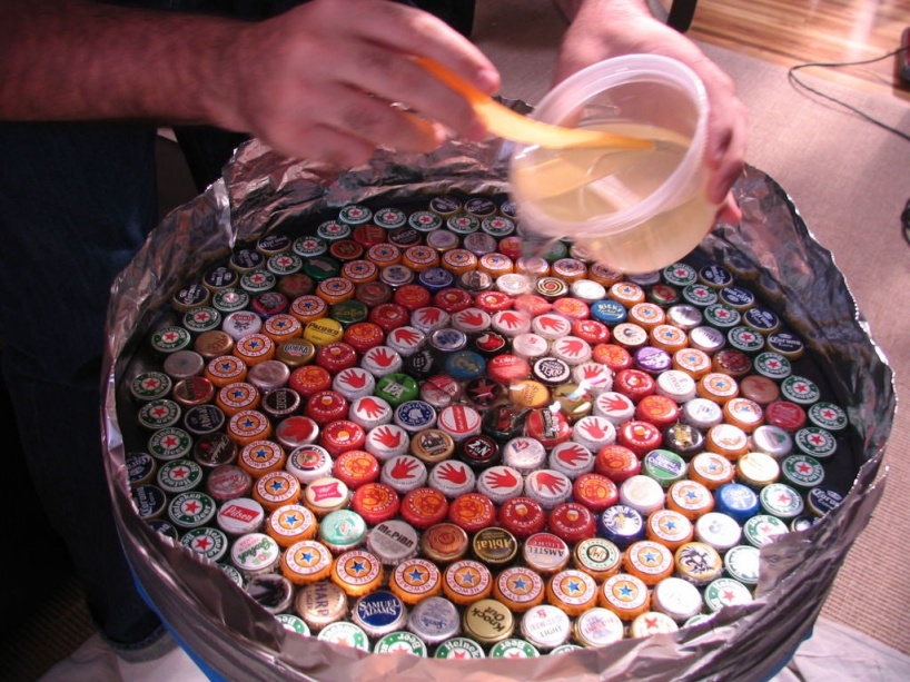 Я не буду расписывать то, как смешивать смолу, так как в упаковке есть инструкция, не говоря уже о многочисленных учебных пособиях, доступных в интернете. Смола, которую я использовал, была Envirotex Lite Pour-on High Gloss Finish. Вам нужно будет распределить смолу, чтобы попасть в промежутки между крышками бутылок, а также по краям. Вот почему ваши крышки должны быть приклеены снизу, так как вы будете проводить жестким листом бумаги или пластика по поверхности крышек. Я воспользовался старой страховой карточкой, но хватило бы любого жесткого пластика или картона.