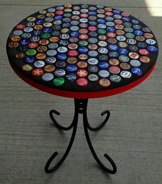 Вы можете сделать стол любого размера. Я видел огромные барные столы, покрытые пенни или старыми фотографиями, но если вы не хотите хранить крышки от бутылок коробками, то для начала подойдет небольшой кофейный столик.