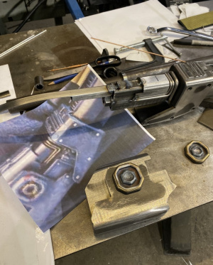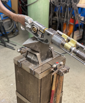Корпус приклада был сделан из нескольких кусков 1/8 листового металла сваренных и отшлифованных вместе, чтобы соответствовать бластеру.