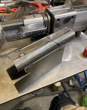 Чтобы сделать первую часть корпуса ,мне пришлось использовать множество типов материалов: верхняя рейка была сделана из цельного бруса размером .750 на 1 дюйм, боковые стороны были сделаны из листового металла 1/8 дюйма, а нижняя часть была сделана из бруска, затем я сварил ее вместе, чтобы сделать канавки на верхней рейке, я прижал её на своём кузнечном станке.