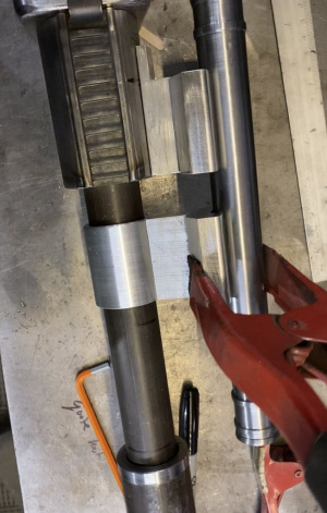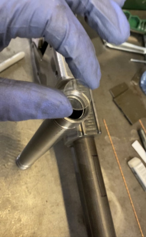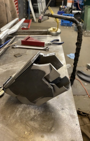 Нижняя треугольная часть под вилкой была сделана из алюминиевой заготовки, затем приварена к нижней части держателя вилки. Прицел был сделан из трубы толщиной 1 дюйм затем повернут на токарном станке, чтобы выглядеть как прицел, небольшие кусочки пластика были установлены для внешнего вида участка стекла.