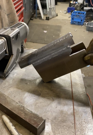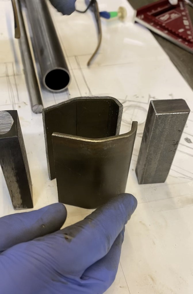 Чтобы сделать второй слой который будет частично покрывать трубу, я использовал 1/8 плоской стали и 1 дюйм 3/8 круглой трубы, затем сварил их вместе и отшлифовал на ленточно шлифовальном станке.