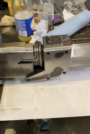 Чтобы сделать вторую часть перед передней рейкой, я сделал шаблон, затем разрезал стальную пластину и добавил четверть дюйма стали с каждой стороны, после того как я просверлил отверстия для поддельных заклепок, я сделал верхнюю и нижнюю часть, затем сварил их вместе и заточил на ленточной шлифовальной машине. Я использовал кусок прямоугольной трубки 1”x2”, чтобы держать их вместе.