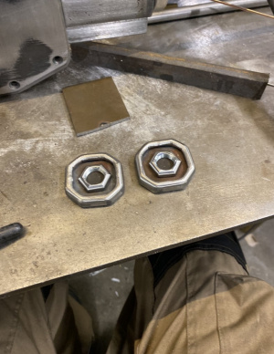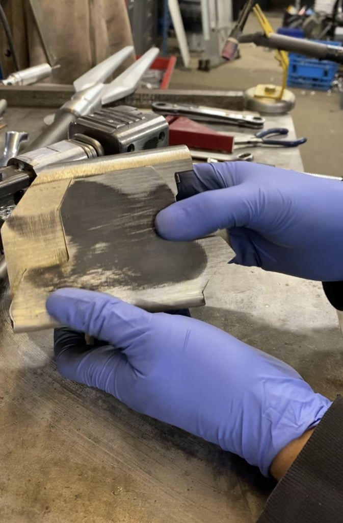 Небольшой держатель был сделан из квадратной трубы диаметром три четверти дюйма, затем разрезанной с одной стороны, внешний держатель эмблемы сделан из плоской стали с четвертью дюйма, разрезанной на ленточной пиле, а затем сваренной вместе.