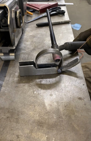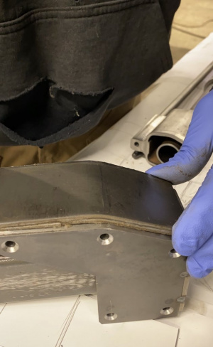 Небольшая задняя часть была сделана из плоской части и круглой трубки большого радиуса, затем поддельная трубка была сделана из четвертьдюймового стержня из нержавеющей стали и 3/16 стержня из нержавеющей стали, они были согнуты, чтобы сформировать форму на небольшом гибочном устройстве.