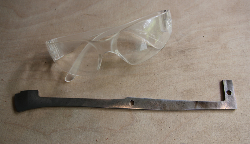 Затем я перенес на пильное полотно форму лезвия и нижней части топора и вырезал их на угловой шлифовальной машине с тонким отрезным диском. Затем я использовал дисковую шлифовальную машину, угловую шлифовальную машину и файлы, чтобы закончить детали. Точная форма нижней части ручки может быть изменена позже.