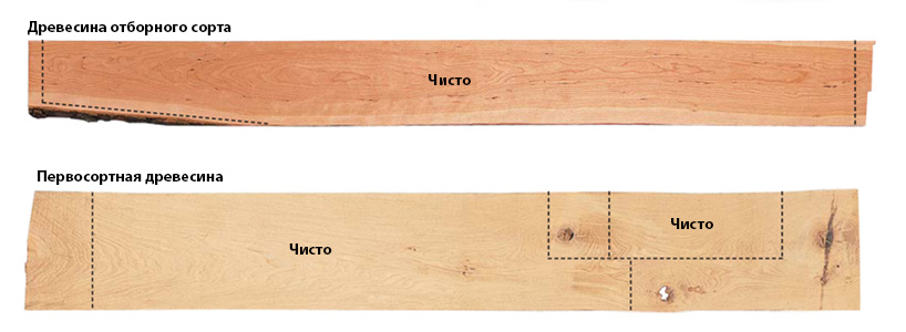 В целом, первосортная древесина имеет больше дефектов, и доски обычно содержат больше отходов. Это несколько снижает её преимущество в стоимости. С другой стороны, некоторые доски первосортной древесины идеальны, но слишком узкие или короткие для отборного сорта.