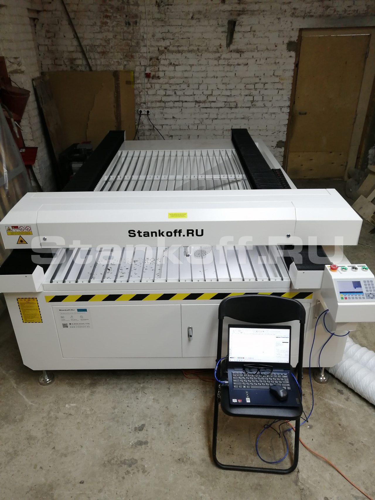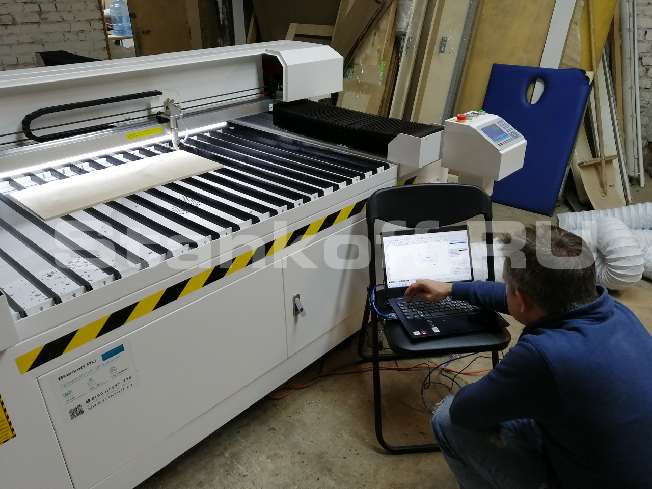 При проведении пусконаладочных работ станок был установлен в рабочей зоне. Была установлена и подключена лазерная трубка, произведена сборка системы охлаждения и аспирации, произведена отладка программного обеспечения, настройка оптического тракта, произведена юстировка станка, определены параметры резки. С персоналом клиента проведен инструктаж по работе со станком и по его техническому обслуживанию.