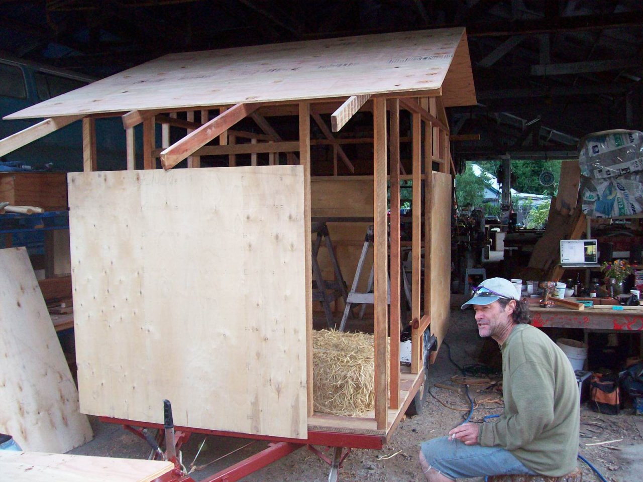 Мы решили свесить листы по углам и позже обрезать их острой ножовкой. Мы сделали то же самое с окнами и линией крыши, но с использованием сабельной пилы там, где ножовка не поместилась бы. Крыша была покрыта фанерой толщиной 1/2 дюйма для прочности и легкости.