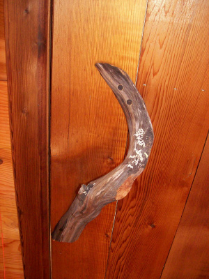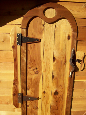 Дверь оказалась очень хитрой штукой. Мы решили, что её нужно скруглить, так как прямых линий в дизайне дома уже было очень много. В конечном итоге это было достигнуто путем вырезания изгиба большой плиты из красного дерева 2х12, добавления другого каркаса и обшивки снаружи фанерой толщиной 1/8 дюйма, а затем покрытия обеих сторон тонкими досками из строганного кедра, пихты и красного дерева.