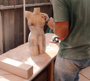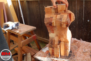 А теперь самое интересное! Я использовал бензопилу, чтобы вырезать большую часть скульптуры. С её помощью я убрал большие куски материала. Я старался держаться подальше от моего контура, так как эпоксидная смола очень легко отслаивается. Когда у меня начала появляться форма моего изделия, я переключился на угловую шлифовальную машину с различными резьбовыми дисками. Она снимала меньше материала, и я мог быть более точным при резке. Я также использовал свою прямую шлифовальную машинку с насадками для резьбы, чтобы работать в труднодоступных местах. Признаюсь, это заняло очень МНОГО времени!