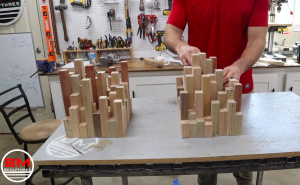 Я положил в ряд 8 досок и отметил на каждой из них произвольную высоту. Затем я обрезал их по этой высоте. Благодаря этому у меня получилось разная длина у каждой породы дерева. Для этого проекта мне нужно было, чтобы ширина составляла 8 досок, поэтому я склеил вместе 8 разных по размеру и по породе заготовок. Мне пришлось проделать это целых 16 раз!