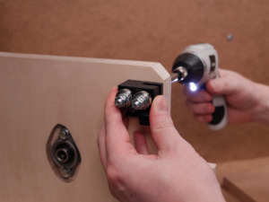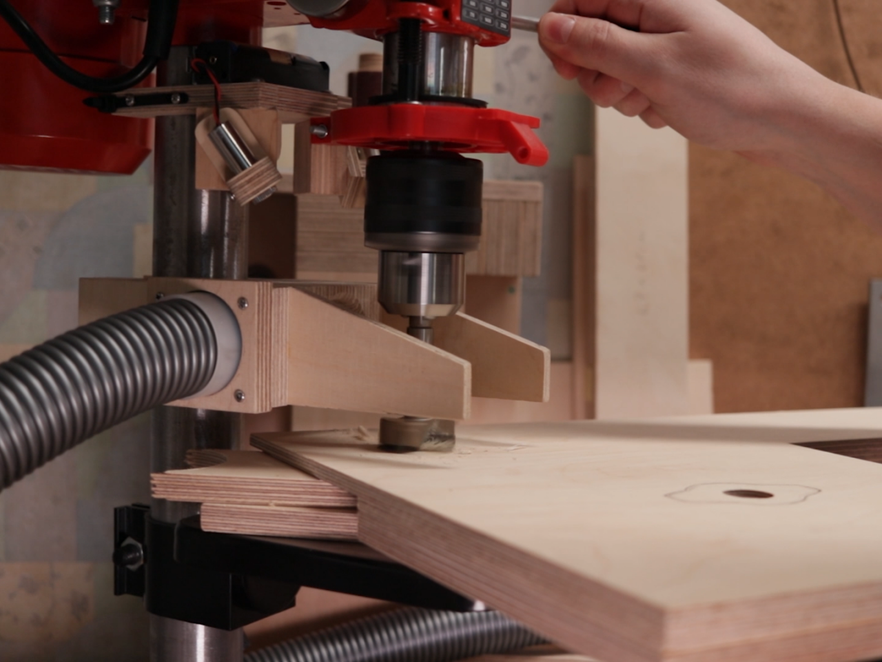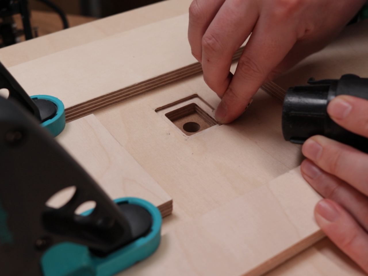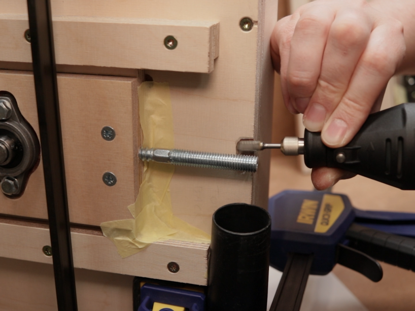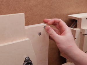 Чтобы зафиксировать его на месте, я сделал отверстие для болта и прорезь для гайки, чтобы он сидел заподлицо. Чтобы зажать его на месте - я использовал шайбу и ручку. Это очень простая система, но она очень прочно удерживает стол на месте.