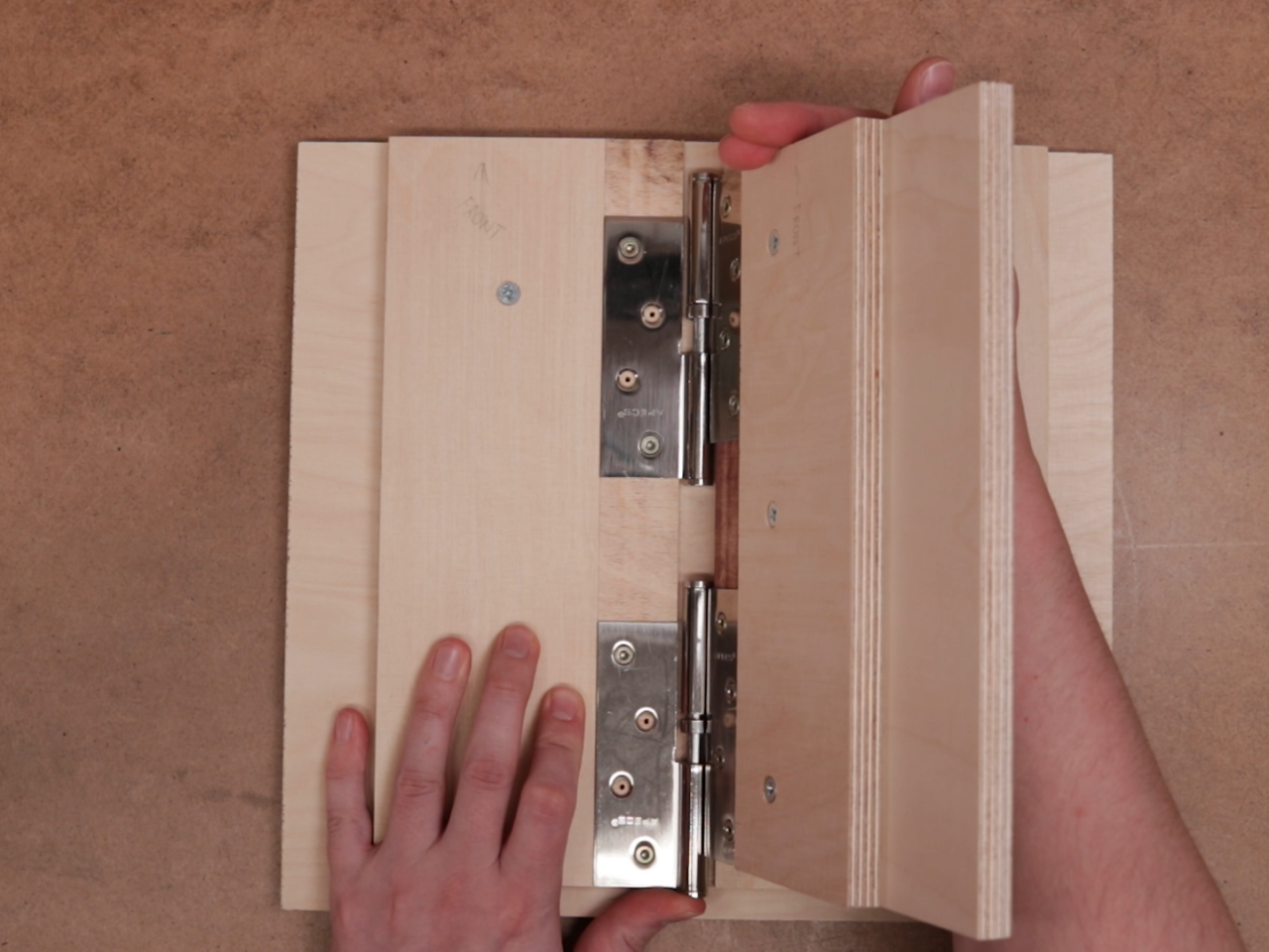 Чтобы сделать основу, я вырезал больше деталей. Я проделал пазы в нижней и верхней части стола, чтобы петли входили внутрь. Чтобы временно закрепить петли в верхней части стола, я использовал двусторонний скотч. А чтобы идеально просверлить пилотные отверстия в середине, я использовал самоцентрирующиеся сверла.