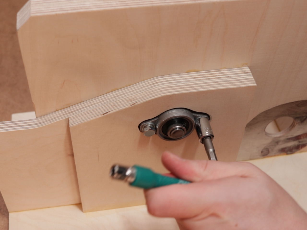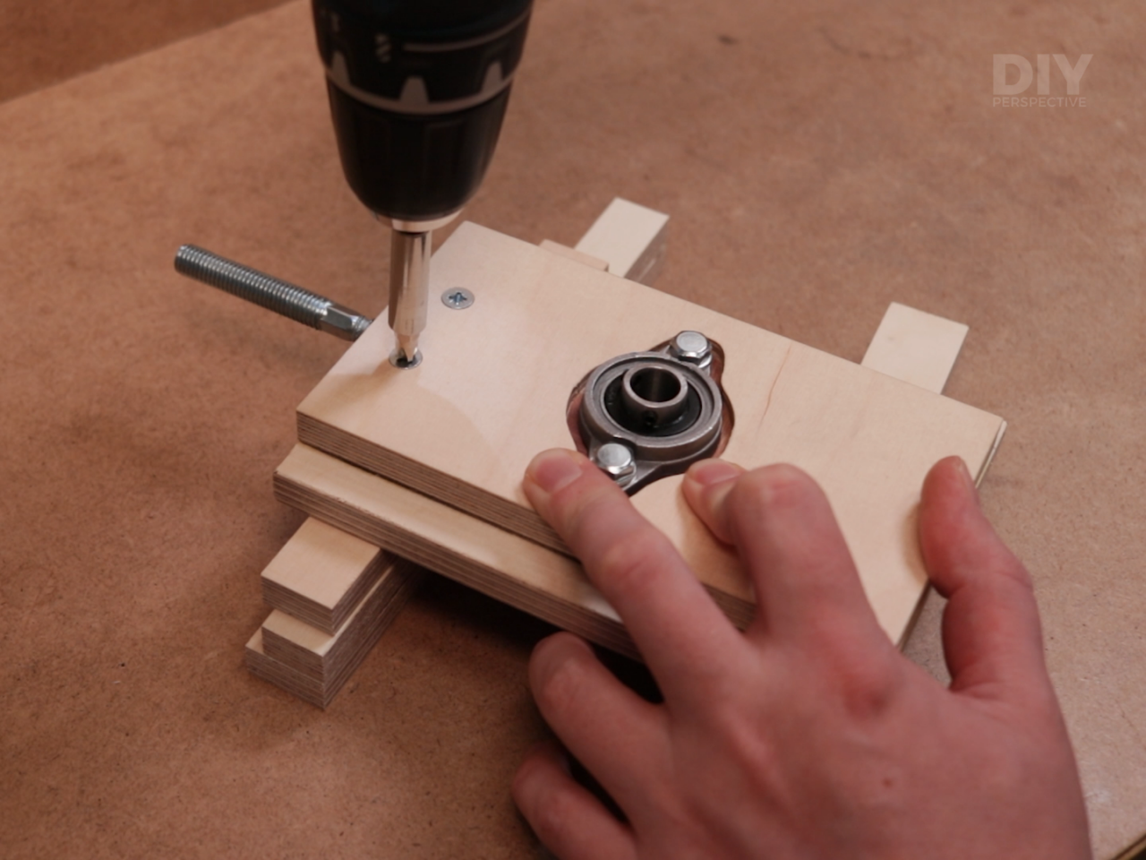 Когда колеса были готовы, я закрепил передний подшипник двумя большими шурупами по дереву и проделал паз для заднего подшипника. Опять же, это потому, что у меня были короткие валы для колес. С помощью двух дистанционных блоков из фанеры я закрепил подшипник так, чтобы колесо было параллельно раме.