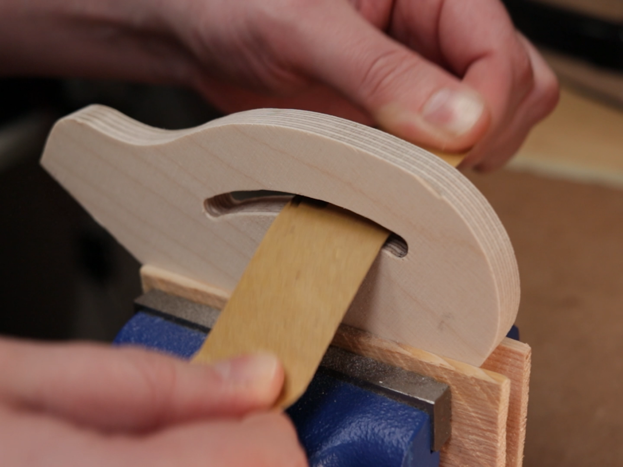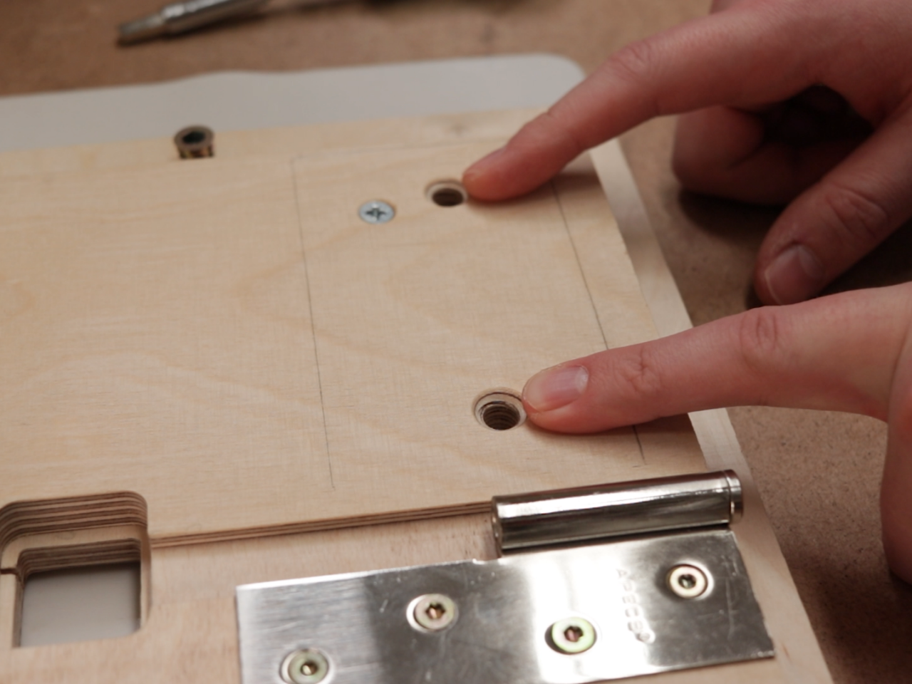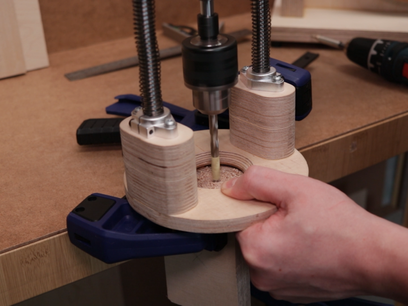 Затем я сделал деталь с резьбовыми вставками, которая будет удерживать крышку лезвия. Сначала я зажал деталь между обрезками, чтобы получить идеальный угол с помощью направляющей для сверла и чтобы резьбовая вставка не расколола фанеру.