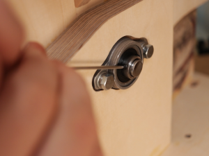 В верхней части натяжной части колеса я проделал отверстие под этот необычный болт. Вы можете видеть, что я часто использую сделанную мной направляющую для сверла, благодаря ей можно сделать прямые отверстия почти везде, мне это нравится!