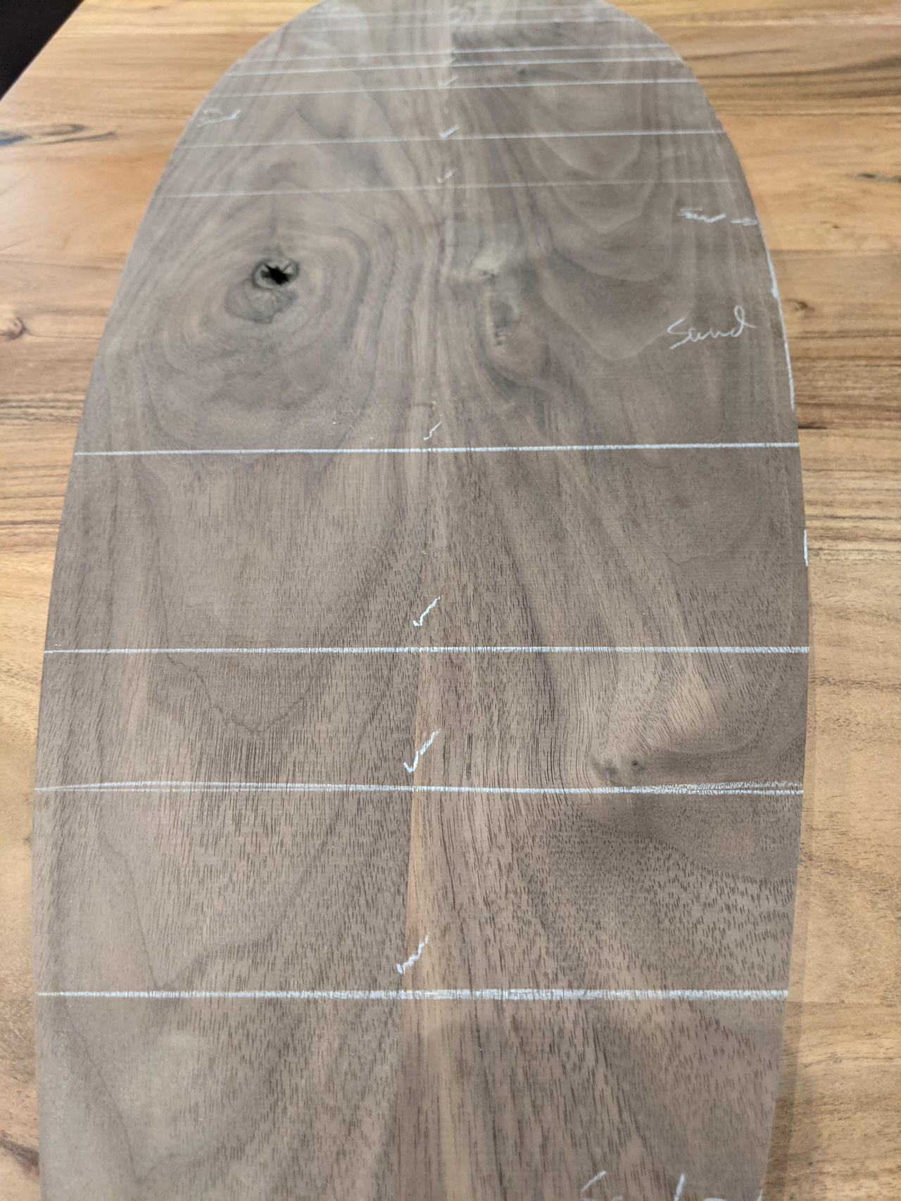 Я отшлифовал свою доску с помощью эксцентриковой шлифовальной машины, начиная с зернистости 150, а затем перешел на наждачную бумагу зернистостью 120. Отшлифуйте все поверхности доски. После шлифовки можно начинать отмечать места отверстий для болтов, которые будут удерживать подвеску на доске.