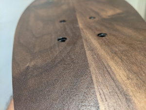 Я не хотел добавлять на свою доску специальное покрытие для скейтборда против скольжения, чтобы было видно красивую текстуру орехового дерева как сверху, так и снизу. Вместо этого я использовал спрей против скольжения, обычно используемый для деревянных или каменных лестниц. Я нанес эту отделку на верхнюю часть доски и позволил ей застыть в течение 24 часов. Данный круизный скейтборд создавался не для бомбардировки холмов или выполнения трюков, а только для спокойного катания, так что это решение прекрасно работает.