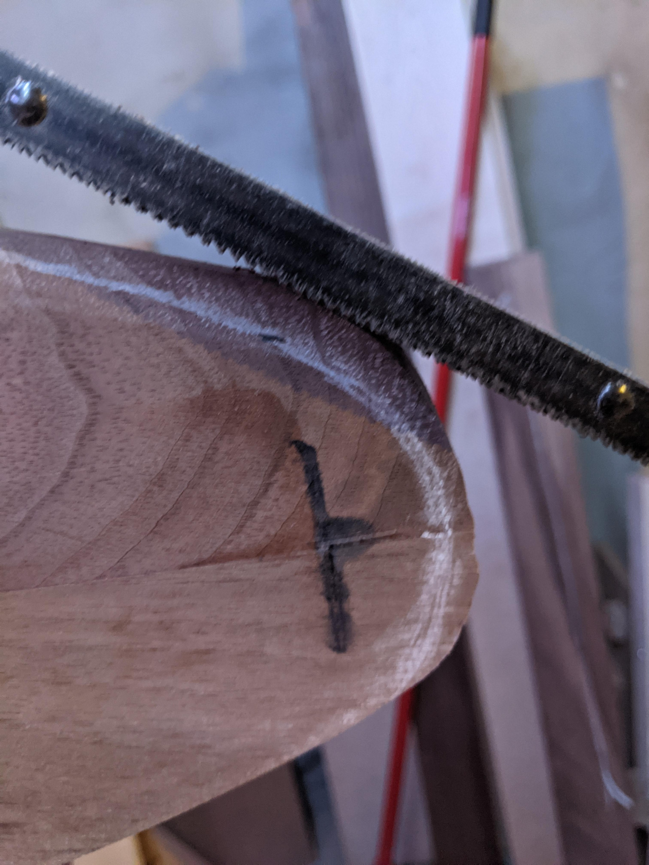 Начиная с одной половины доски, начните использовать комбинацию скобеля для снятия фасок, рубанка и рашпиля, чтобы приблизиться к намеченным вами линиям. Я использовал рубанок для удаления основной массы древесины, а затем скобель для более тонкой работы. На двух концах доски я использовал рашпиль, так как они расположены ближе к торцевому зерну и их трудно обработать скобелем. Вы также можете использовать лобзик, чтобы удалить большую часть отходов на торцах доски, так как с ними сложно справиться с помощью циркулярной пилы. После придания формы одной половине доски в соответствии с линией, можно приступать к работе над другой стороной.