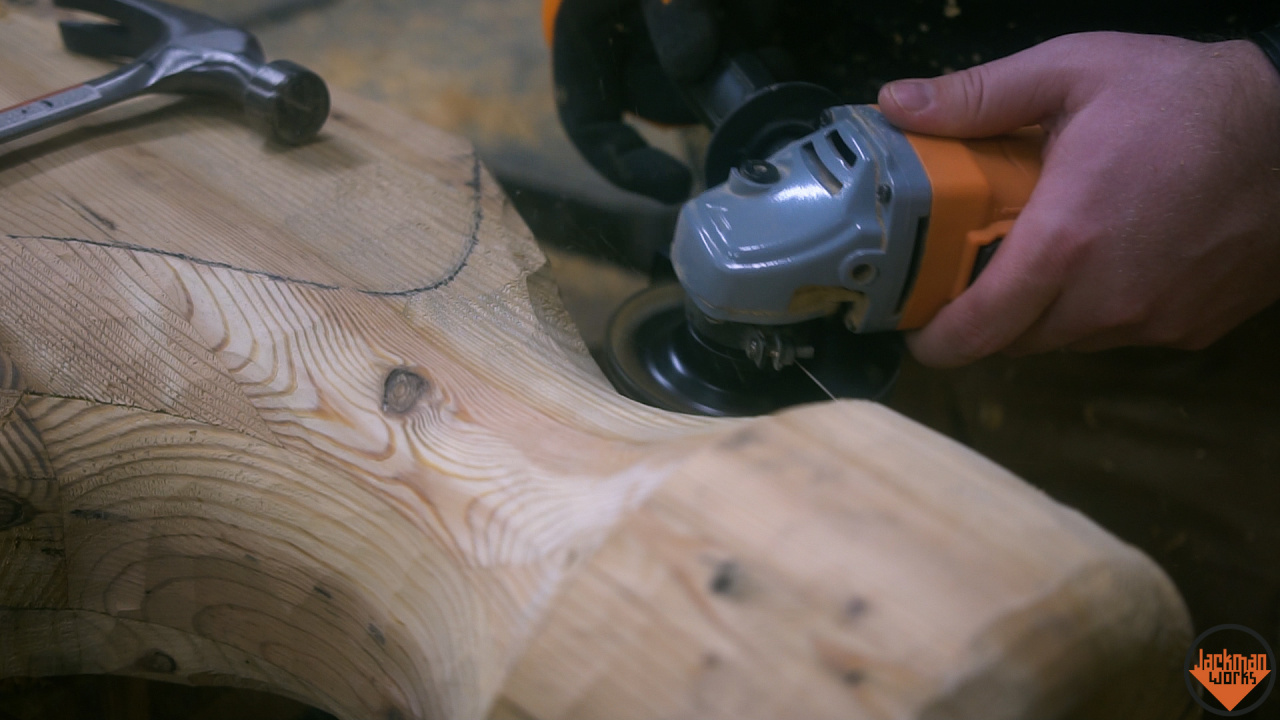 Я оставил эту часть на как можно более поздний срок, потому что, когда я вырежу гвоздодер, зерно сделает его намного слабее, но также потому, что я знал, что вырезать гвоздодер и зачистить материал будет мучительно. Я начал распил с помощью японской пилы, а затем перешел на вибрационную пилу.