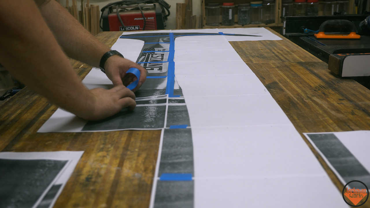 Я перфекционист, поэтому я начал с того, что тщательно сфотографировал оригинальный молоток, увеличил его изображение до 8 футов в высоту, а затем распечатал и склеил части фотографий вместе. Почему я выбрал длину 8 футов? Ну, бруски из дерева, которые у меня были, были чуть более 8 футов в длину, так что я подумал, что что-то меньшее будет пустой тратой! Однако моя спина несколько раз сообщала мне что мой выбор был опрометчивым.