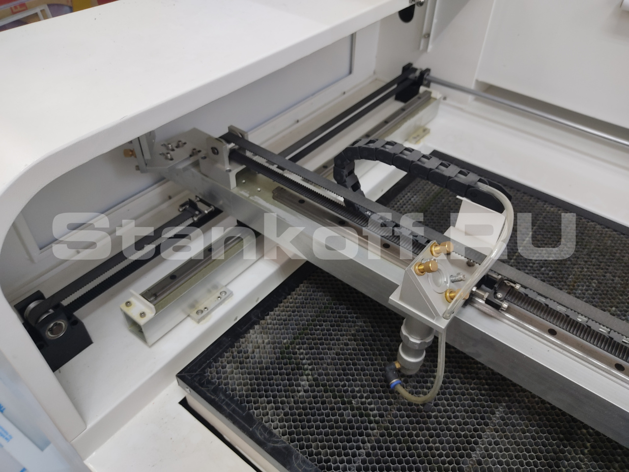 Рабочий стол – 900х600 мм; Мощность трубки – 100 Вт; Ресурс – 10 000 моточасов; Потребляемая мощность – 1,5 кВт: Вес – 340 кг.