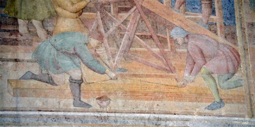 Хотя мы не видим, какой разметочный инструмент используется, плотники в третьем ряду слева собираются щелкнуть леской.