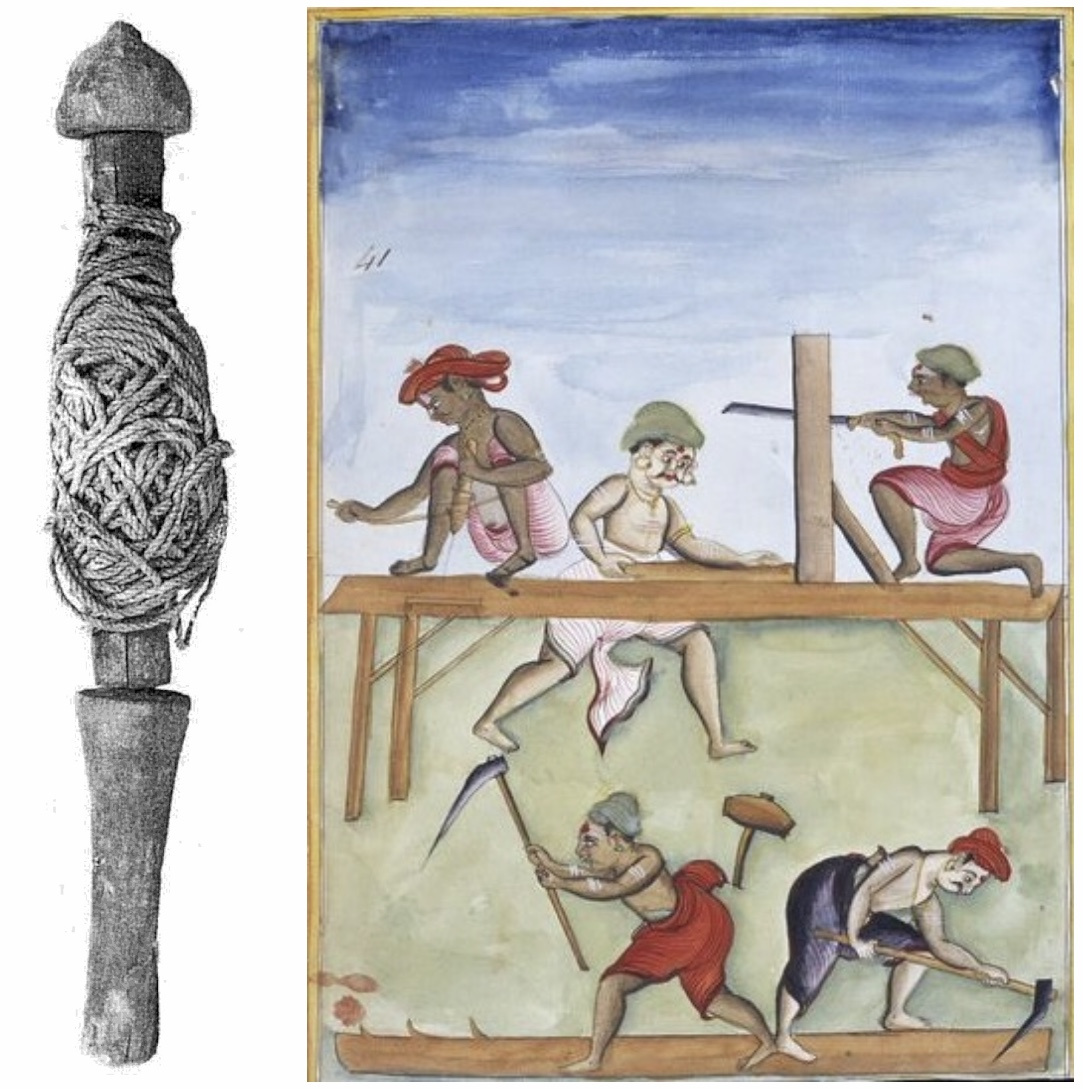 Слева: инструмент для нанесения линий древнеегипетского каменщика, найденный в гробнице Среднего царства в Дейр-эль-Бахри. Справа: плотники, Мадрас, Индия, ок. 1785 г., Музей Виктории и Альберта.