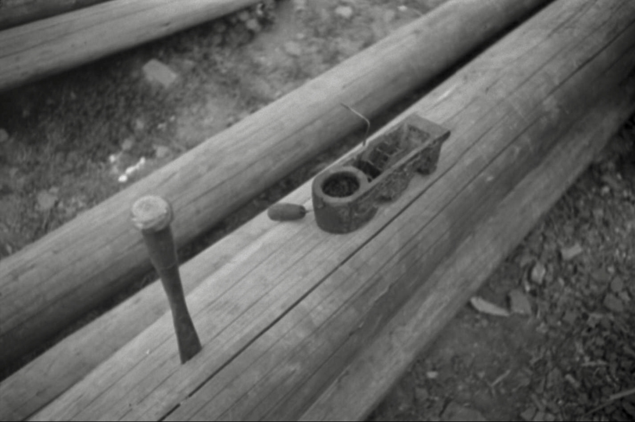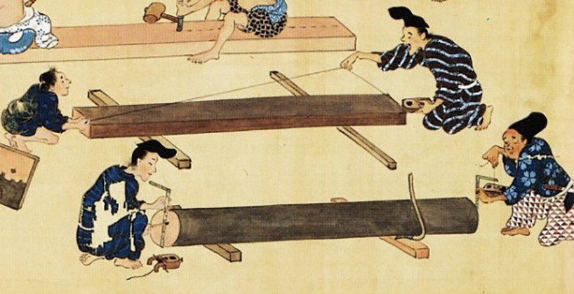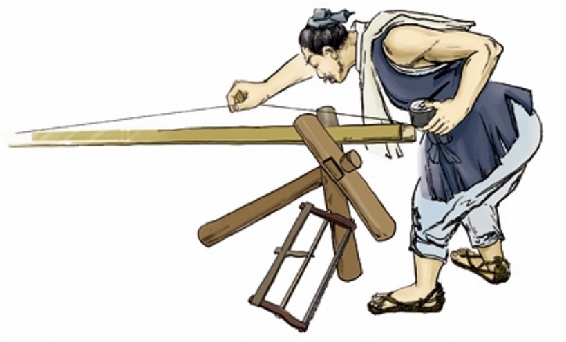 На переднем плане главный плотник держит сумицубо и собирается сделать щелчок леской, а ученик держит конец шнура. Подробнее про сумицубо вы можете прочитать в нашей статье в блоге.