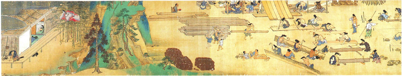 Этот свиток был выполнен красками и тушью на шелке. На нем изображены последовательные задачи: разметка бревна для раскалывания, прочерчивание линии на доске, которую нужно распилить или расколоть, плотники, сидящие на доске и раскалывающие ее на две части.
