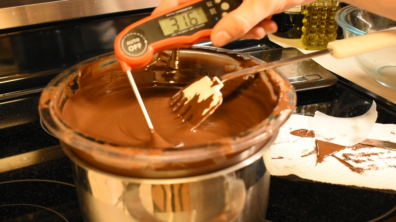 Чтобы темперировать шоколад, я сначала применил метод посева. Для начала я нагрел кастрюлю с водой на слабом огне и выложил шоколад в миске. Постепенно нагрел шоколад до 45-50 градусов по Цельсию, чтобы кристаллическая структура шоколада полностью разрушилась, затем охладил шоколад, используя уже темперированный шоколад, который засеивается и превращает шоколад обратно в кристаллическую структуру, которую мы хотим. Как только шоколад остынет до 31-32 градусов по Цельсию, он готов к использованию.