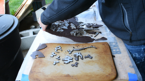 В своей третьей попытке я попробовал сделать листы шоколада без формы. Поскольку лазерная резка форм доставляла немало хлопот, я хотел проверить, будет ли качество сопоставимым, если бы я просто попытался расплющить расплавленный шоколад между двумя листами вощеной бумаги.