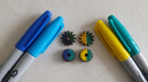 При окрашивании подумайте, как бы вы хотели, чтобы ваши шестеренки различались для конечной игрушки. см. рисунок выше: У меня были простые цветовые схемы, но я нанес их на разные грани, чтобы сделать игрушку более интересной.