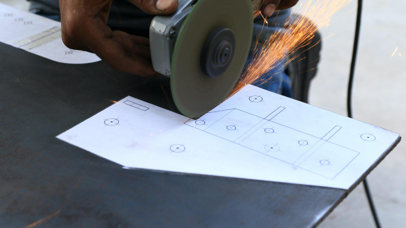 Приклеиваем распечатанные планы к металлическому листу и с помощью угловой шлифовальной машины и лобзика вырезаем все части.