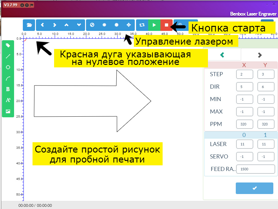 Эта начальная точка будет соответствовать красной дуге в позиции (0,0) (см. изображение). Нарисуйте простое изображение с помощью инструментов рисования слева. Нажмите зеленую кнопку "Старт", чтобы начать печать. Нажимайте круглую кнопку лазера отвечающую за регулировку до тех пор, пока луч не станет резким.