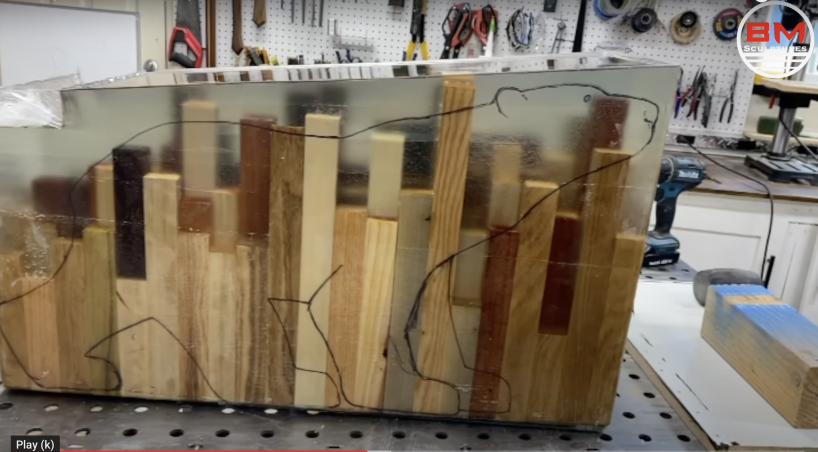 Для создания скульптуры я использовал 9 галлонов эпоксидной смолы и различные породы дерева. Сначала я обработал доски из ореха, красного дерева, дуба, тополя и сосны. Я использовал различные деревообрабатывающие инструменты, чтобы добиться одинаковой толщины. Затем я использовал эпоксидную смолу, чтобы залить основу из досок 9 галлонами эпоксидной смолы. После застывания я вырезал и обработал массивный блок с помощью бензопилы, углошлифовальной машинки, шлифовального станка и различных шлифовальных инструментов. На этом пути было много трудностей, но я в восторге от того, какой получилась эта скульптура.
