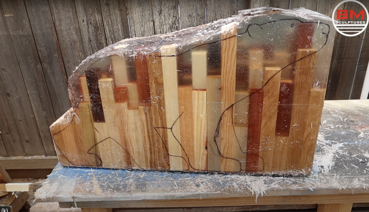 Через неделю после полного отверждения эпоксидной смолы я снял форму. Я был очень доволен тем, насколько прозрачной получилась застывшая эпоксидная смола. Затем я очертил контур медведя на боковой стороне скульптуры, чтобы использовать его в качестве основы для резьбы.