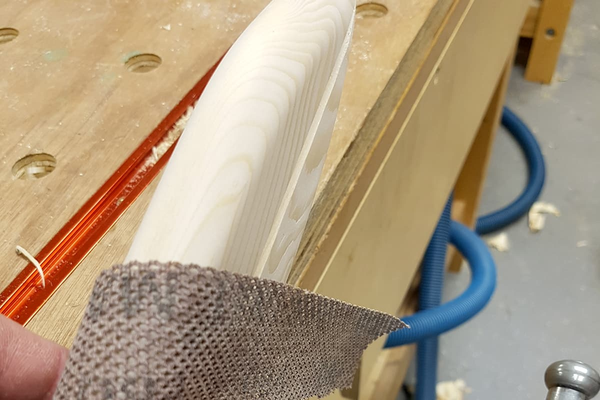 Наконец, для лезвия меча используйте столярный рубанок "spokeshave" и наждачную бумагу, чтобы придать кромке лезвия форму острия. Поскольку это детская игрушка, не делайте его слишком острым. Отшлифуйте лезвие, используя абразив с зернистостью 150.