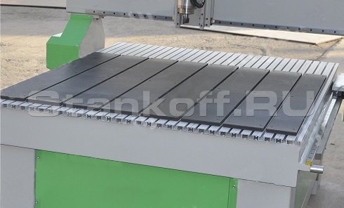 Станина из толстолистового уголка и профилей прямоугольного сечения, прошедшие специальную термическую обработку отжигом, обеспечивают высокую жесткость конструкции, а также долговечность эксплуатации станка без потери точностных параметров. За счет отсутствия вибрации достигается высокая точность обработкиВакуумный стол