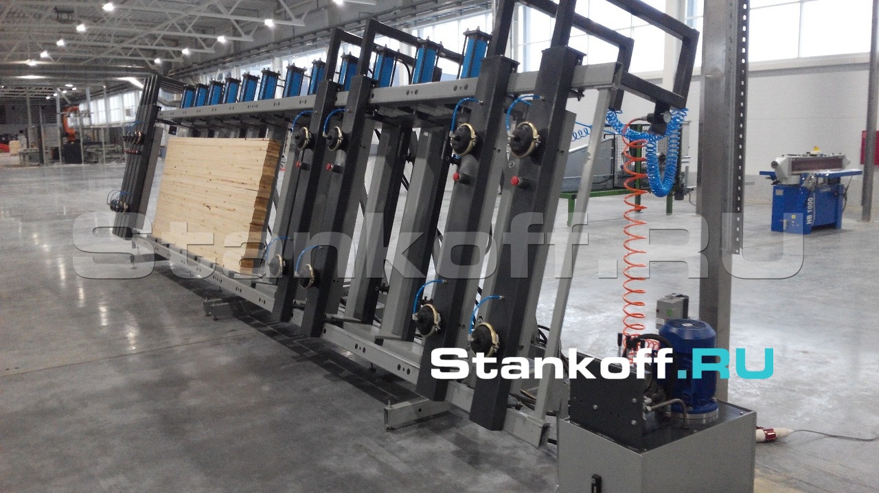 Оператор набирает пакет из заготовок с предварительно нанесенным клеем, далее устанавливает фронтальные прижимы. Процесс прессования начинается после включения оператором вертикальных гидроцилиндров работающих от установленного на пресс гидронасоса, обеспечивая тем самым равномерное распределение нагрузки на заготовки.