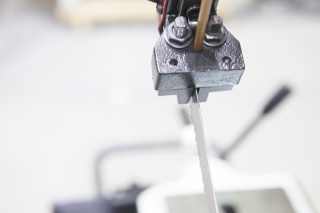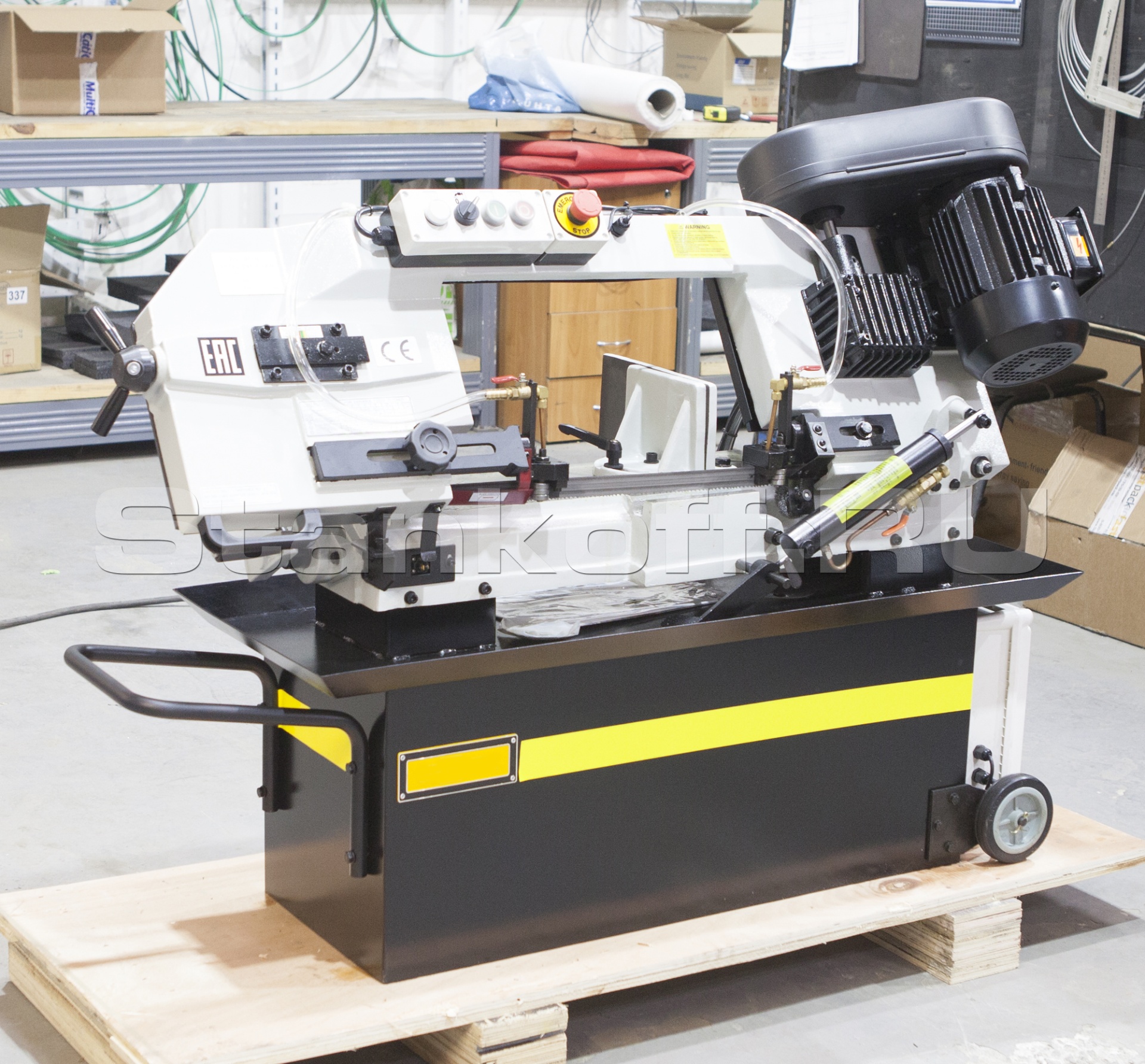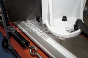 Станок Stalex BS-912G имеет поворот губок тисков, для пиления под углом необходимо изменять угол установки тисков, привод зубчатый. Зажим заготовки осуществляется тисками вручную, подача заготовки - также вручную. Мобильность станков позволяет использовать их на производстве непосредственно там, где это необходимо. Станки находят широкое применение в серийном и мелкосерийном производстве. Система СОЖ в стандартной комплектации, регулировка скорости осуществляется с помощью ступенчатого шкива (4 режима скорости).