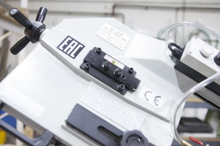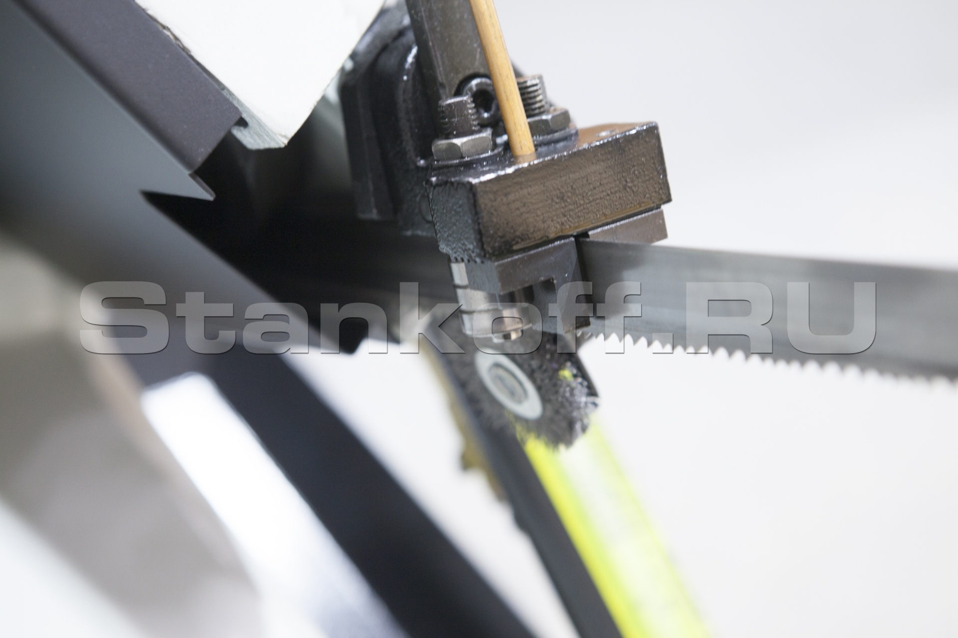 Пила опускается под собственным весом. Cтанок оборудован дросселируемым гидравлическим цилиндрами подач, который позволяет автоматически подстраивать скорость опускания пильной рамы в зависимости от профиля заготовки, что обеспечивает оптимальные режимы распила.