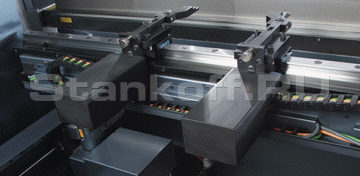 Работа двух гидравлических двигателей - перемещение верхней балки по осям Y1 Y2 - синхронизирована ЧПУ. ЧПУ также управляет системой компенсации прогиба позволяющей равномерно распределять нагрузку по всей длине заготовки для обеспечения гиба без дефектов. Потребность в ручной регулировке отпадает.Передняя поддержка
