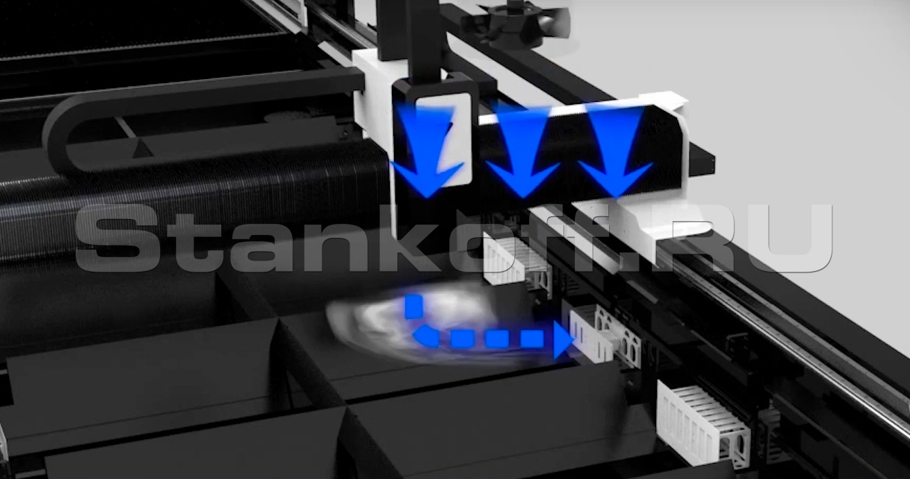 Зональная система дымоудаления обеспечивается секционной конструкцией раскройного стола и встроенными вентиляционными каналами. В каждой секции расположены вытяжные отверстия с пневматическими клапанами, воронки для сбора шлака и выдвижные поддоны для удаления отходов. Пневмоклапаны автоматически открываются только в той секции стола, где в данный момент находится режущая голова, остальные клапаны в это время остаются закрытыми. Отходы, образовавшиеся в процессе резки, проваливаются между ламелями стола в воронки и оседают в выдвижных поддонах для сбора шлака.Гофрозащита и кабельные цепи